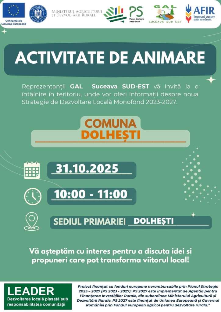 Asociația GAL „Suceava Sud-Est” organizează pe data de 31 octombrie 2025 activități de animare în comuna Dolhești.