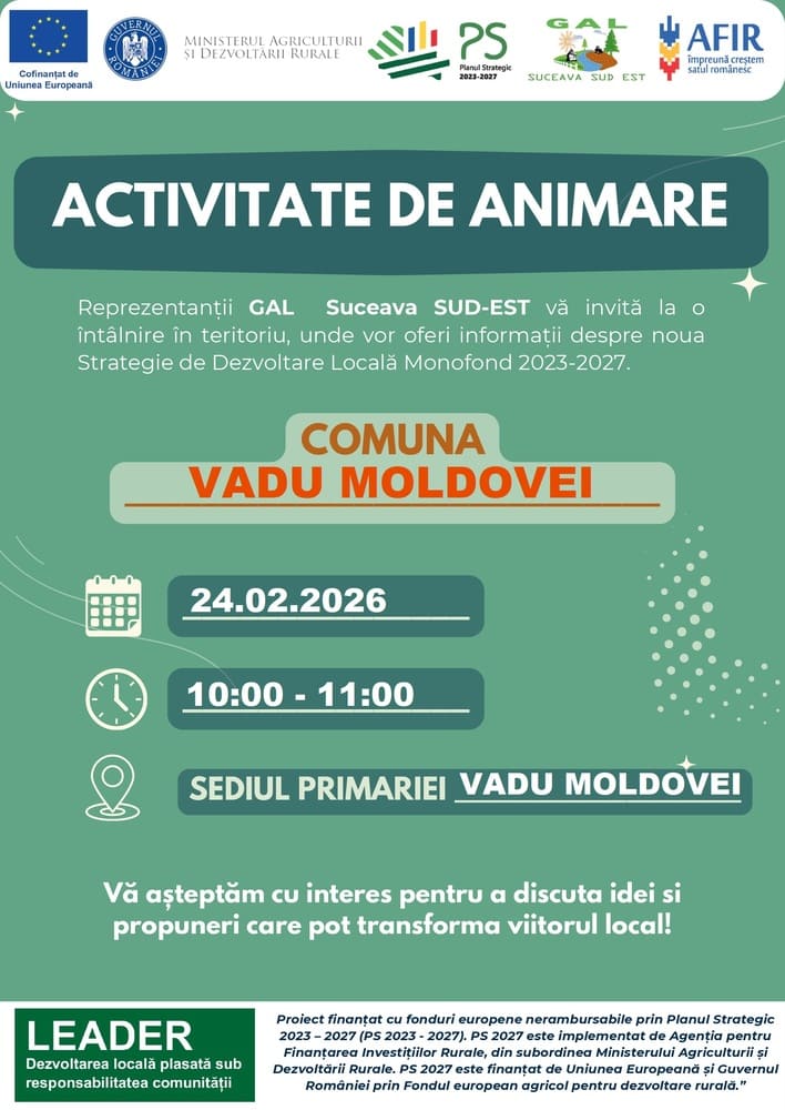 Asociația GAL „Suceava Sud-Est” organizează pe data de 24 februarie 2026 activități de animare în comuna Vadu Moldovei .